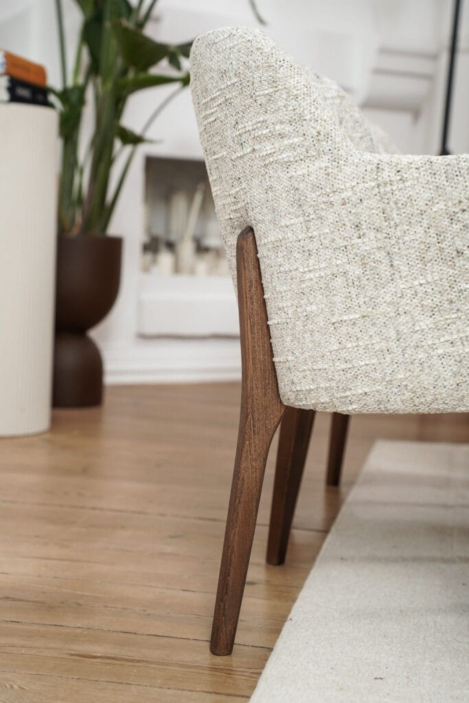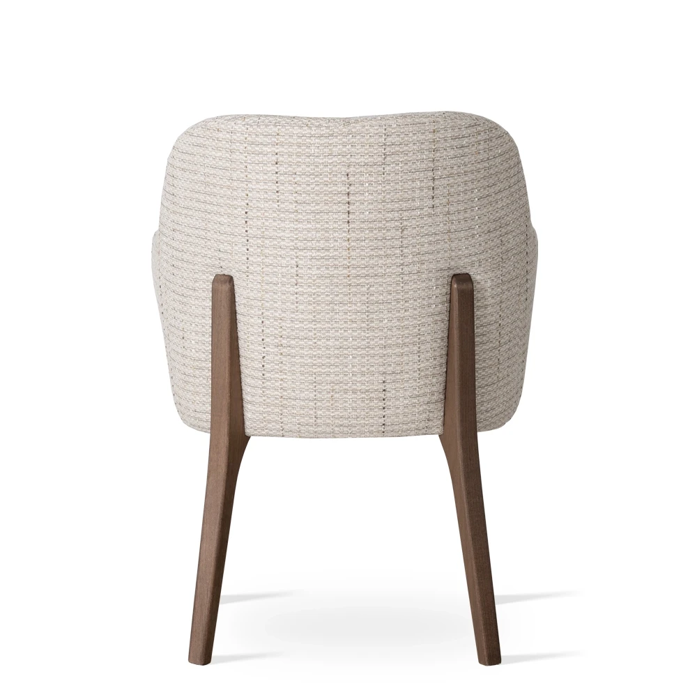 Upholstered in high-quality, textured fabric, the Aurora chair captivates with its natural character and modern lightness. The sturdy, wooden legs in a warm shade perfectly complement its aesthetic, creating a harmonious whole. The combination of materials ensures that this designer dining chair is both durable and stylish.