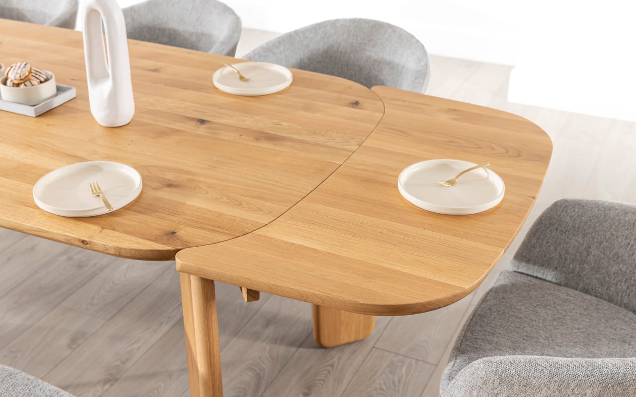 The Quercio table features a minimalist design that blends seamlessly with various interior styles, from classic to contemporary. Its solid oak top is oiled to protect against moisture, highlighting the wood's unique grain and adding depth to its colour. Whether rectangular or round, the table's design introduces a sense of warmth and elegance to any space.