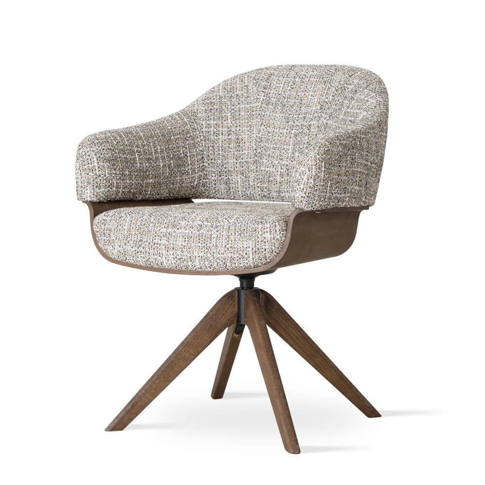 The VENUS chair features a contoured backrest that seamlessly transitions into a side cover, highlighted by a visible walnut plywood insert. This design element not only adds depth but also imparts a designer lightness to the chair, making it a standout piece in any room.
