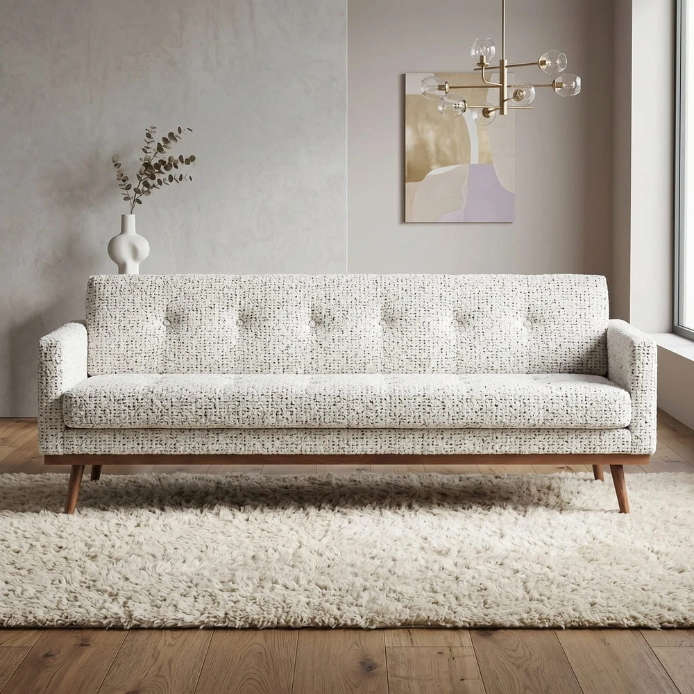 The sofa in the first photo is upholstered with Galaxy fabric, a beautiful, soft velvet that is water-resistant and pet-friendly, while the sofa in the third photo features Rimba fabric, known for its soft and impressive texture.